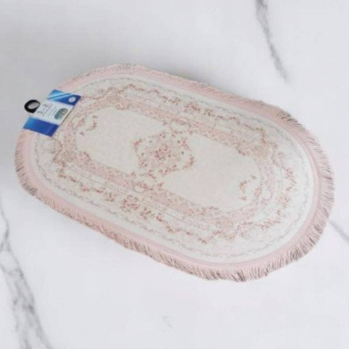 Komplet prostirki u bijeloj boji s ružičastim vintage uzorkom (dimenzije 100×60 cm + 50×60 cm) koji stvara patinirani efekt. Ovalne prostirke s resama po rubu pružaju nostalgičan šarm kupatilu.