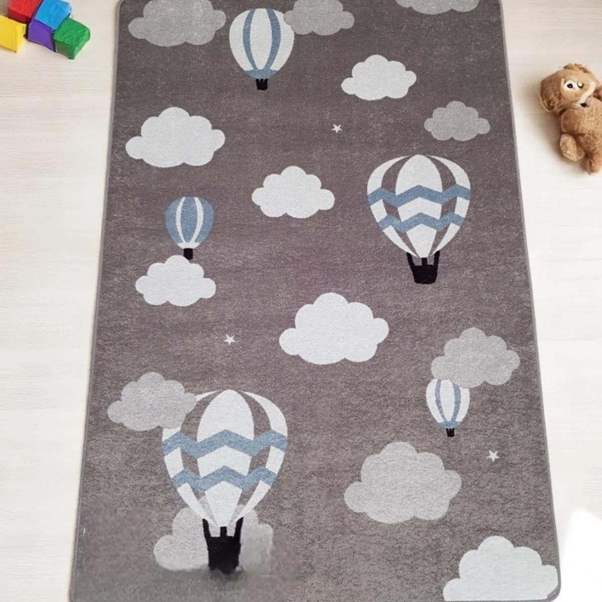 Sivi tepih s veselim motivima balona na vrući zrak i oblaka u bijelim i plavim bojama. Savršen za dječiju sobu i igru.