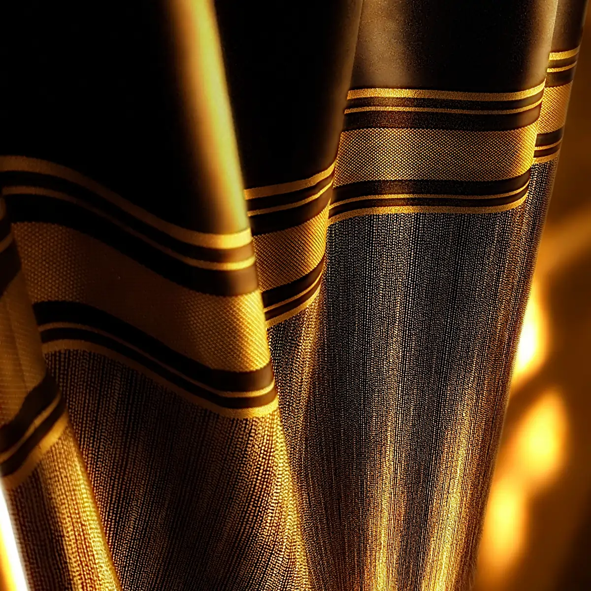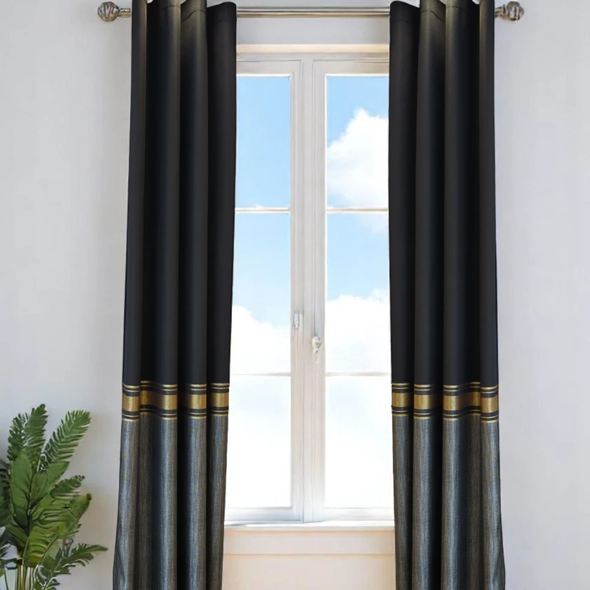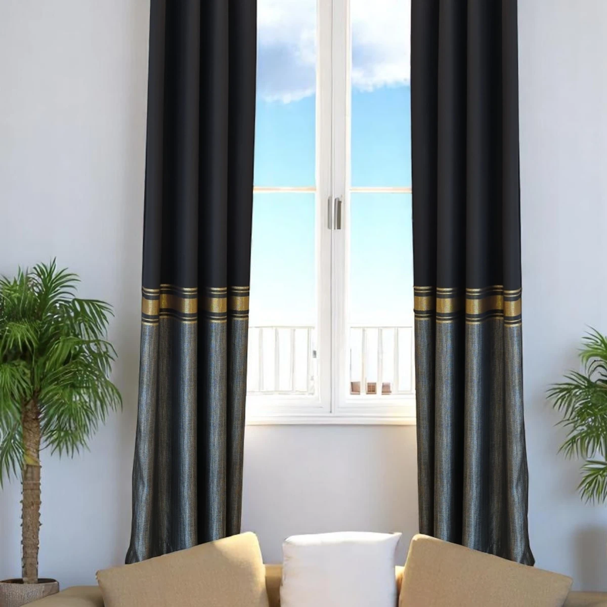 Crne zavjese s dekorativnim zlatnim trakama koje dodaju luksuzni detalj svakom prostoru. Praktičan izbor za kontrolu svjetla i privatnosti.