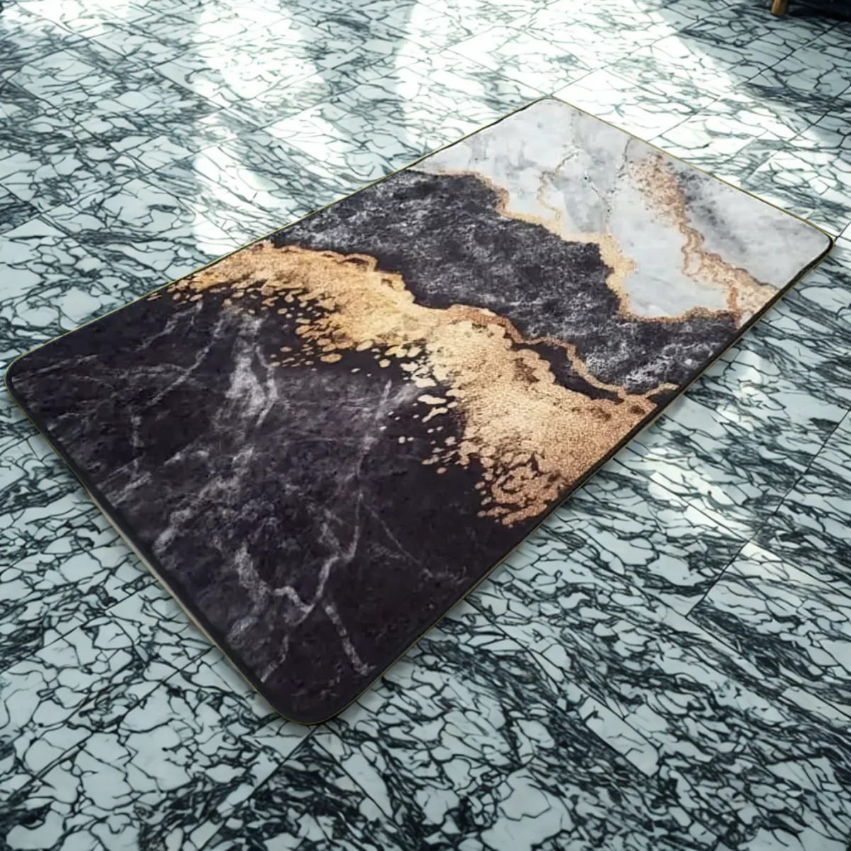 Cenan tepih donosi apstraktnu ljepotu kroz dramatično spajanje crnih, smeđih i zlatnih tonova koji podsjećaju na prirodne kamene formacije. Antibakterijska zaštita za ljubitelje savremene umjetnosti u domu.