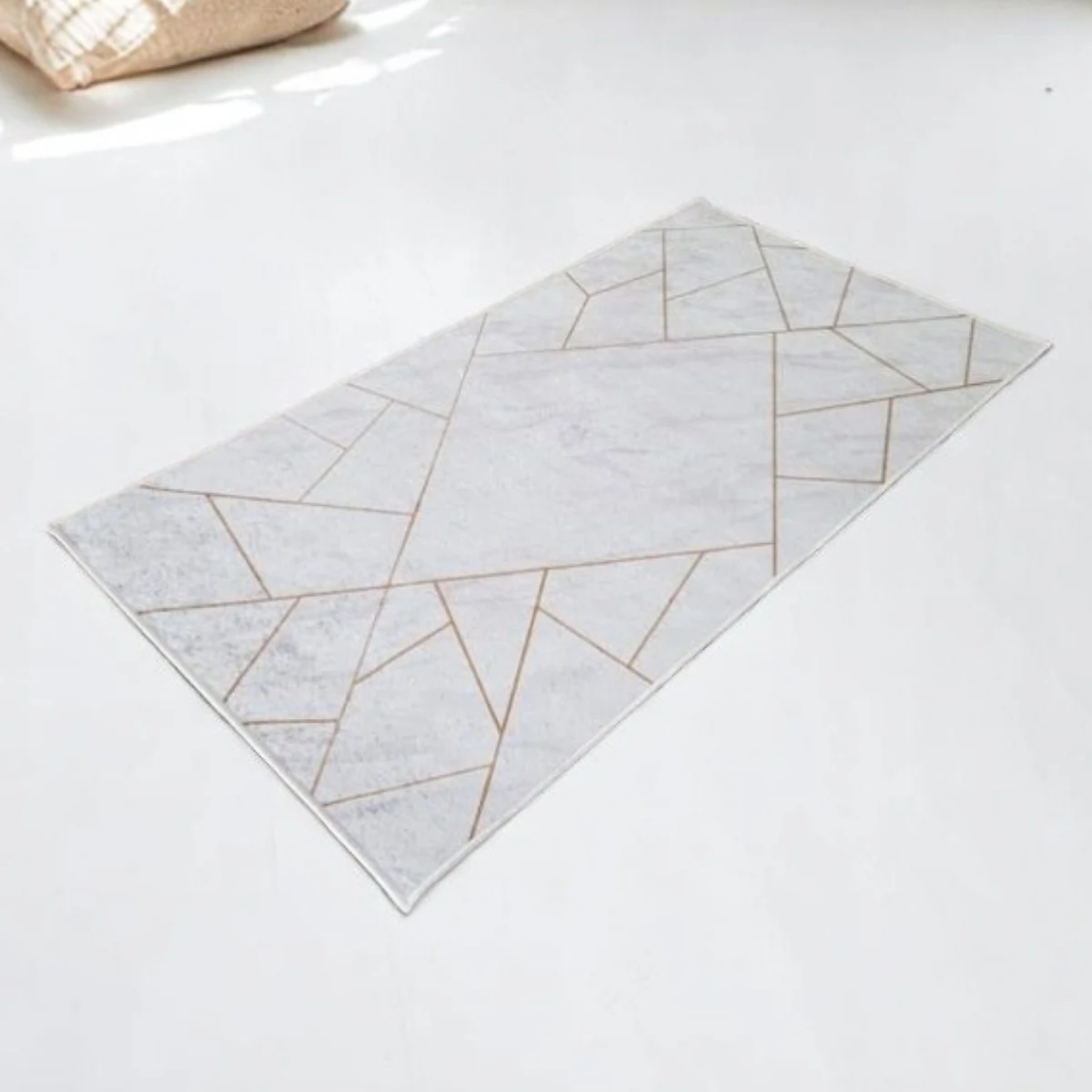 Staza sa sofisticiranim geometrijskim uzorkom zlatnih linija na svijetloj mramornoj pozadini. Suvremeni dizajn s nepravilnim geometrijskim oblicima stvara luksuzan i elegantan izgled idealajan za moderne prostore.