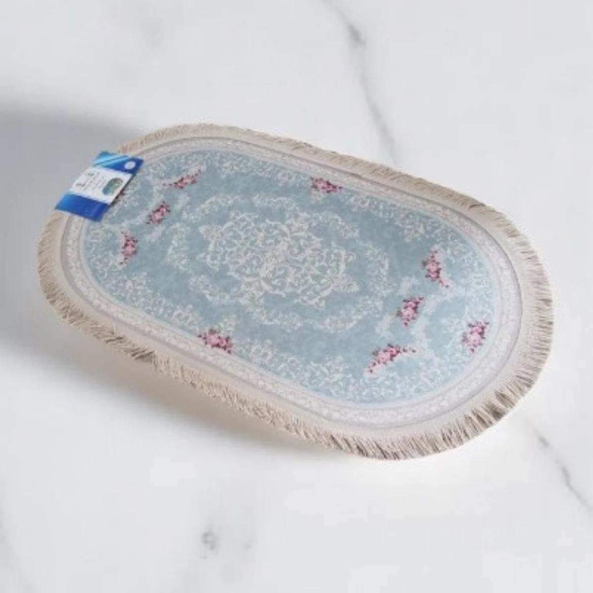 Set od dvije ovalne prostirke (100×60 cm + 50×60 cm) s elegantnim cvjetnim uzorkom u plavoj boji s ružičastim akcentima. Tradicionalan medaljion dizajn sa resama po obodu dodaje klasičan šarm kupatilu.
