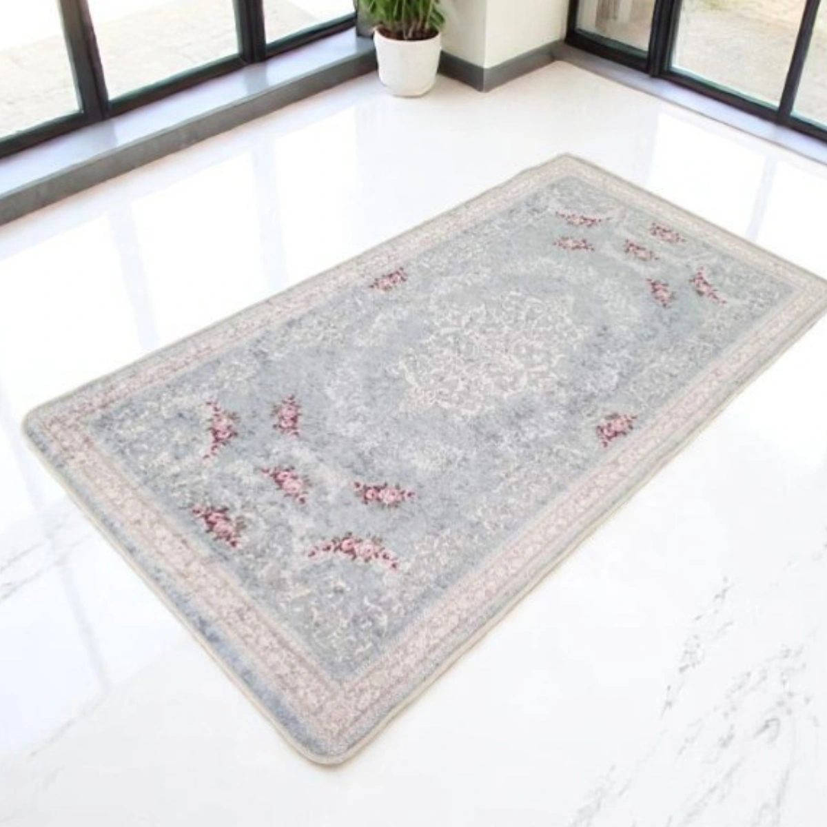 Staza sa elegantnim centralnim medaljionom i raspoređenim cvjetnim motivima u ružičastim tonovima na plavoj pozadini. Tradicionalni dizajn s dekorativnim okvirom donosi klasičnu eleganciju i vintage šarm idealjan za prostore koji traže vremensku sofisticiranost.