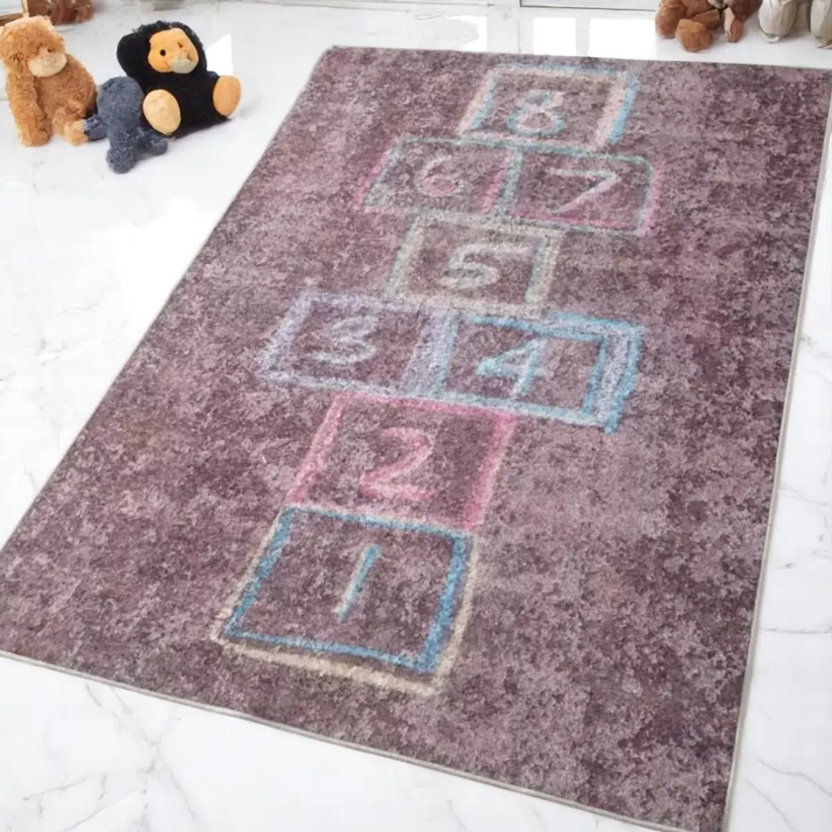 Vijoletni tepih s motivom školice i brojevima u šarenim bojama. Idealan za igru i učenje brojeva.