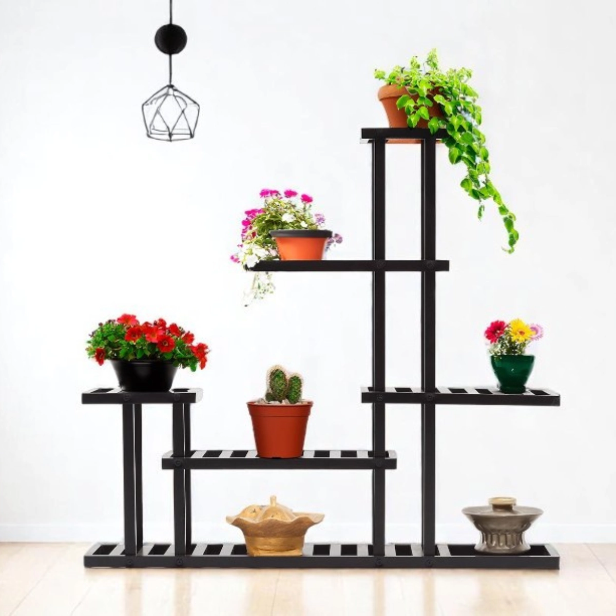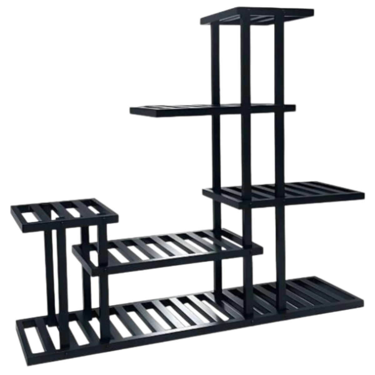 Crni aluminijski stalak za biljke s 6 polica različitih veličina. Idealan za organizaciju biljaka na terasi, balkonu ili u stanu. Elegantni dizajn omogućava višenamjensku upotrebu.