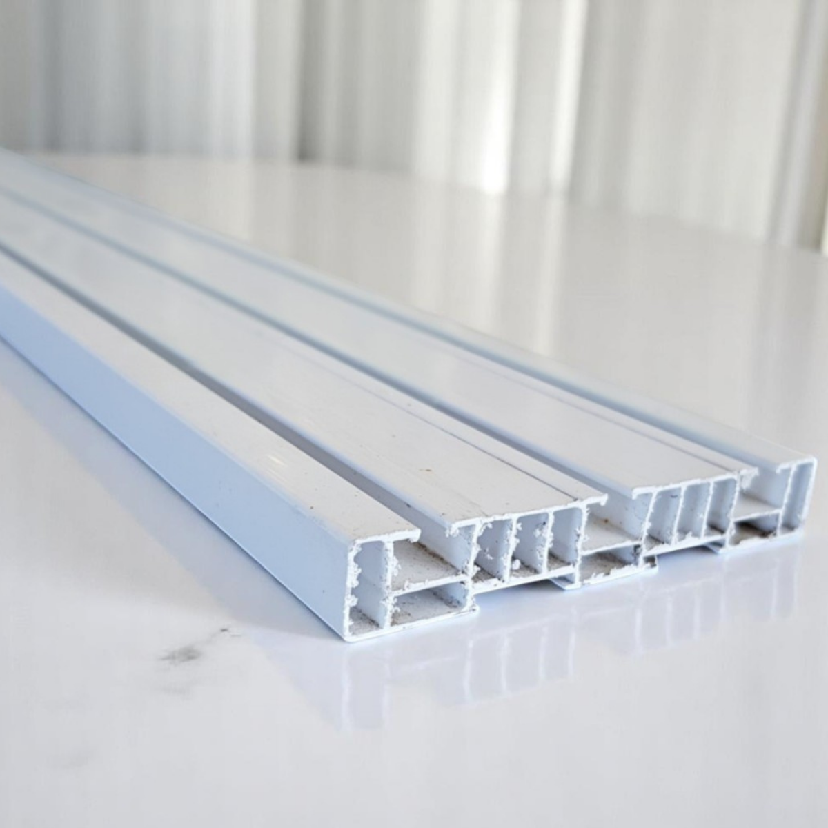 Bijela PVC karnišla dizajnirana za funkcionalno rješenje zavjesa. Sistem s tri kanala omogućava kombiniranje različitih tipova zavjesa za potpunu kontrolu svjetlosti i privatnosti.