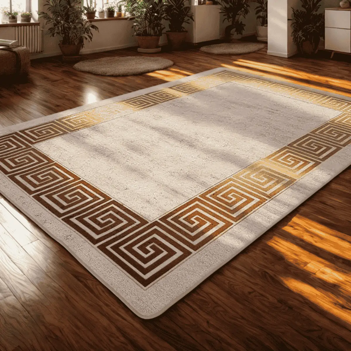 Elegantan Smart Gold tepih s tradicionalnim grčkim ornamentima u toploj zlatno-braon paleti koji dodaje luksuznu notu svakom prostoru. Premium kvaliteta s antibakterijskom zaštitom i antikliznom podlogom za sigurnost cijele porodice.