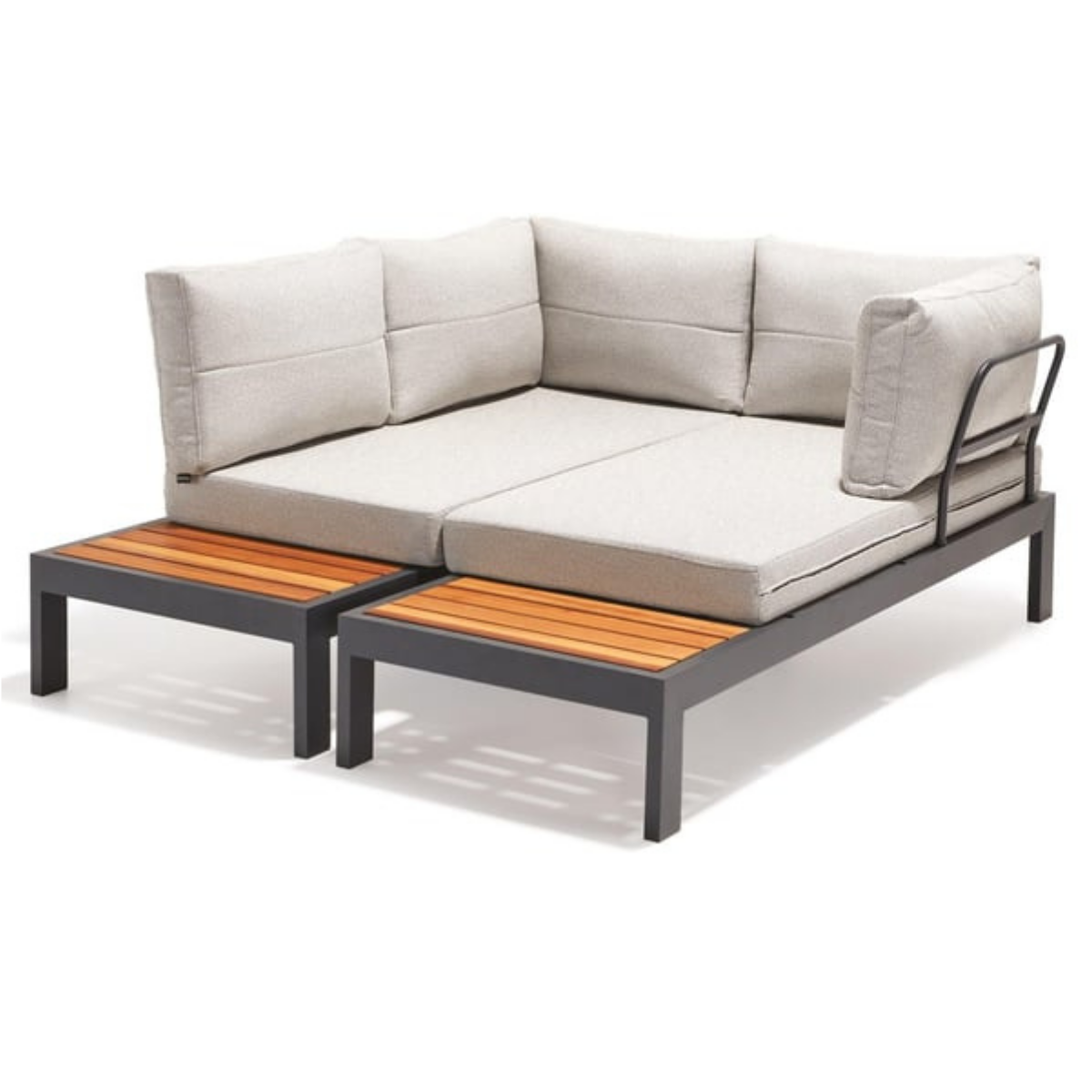Verona corner set (L-oblik) s aluminijskim okvirom u antracit boji, Olefin AGVA 22 tapaciranjem i Iroko stolicom. Modularno rješenje za optimalno korišćenje prostora.