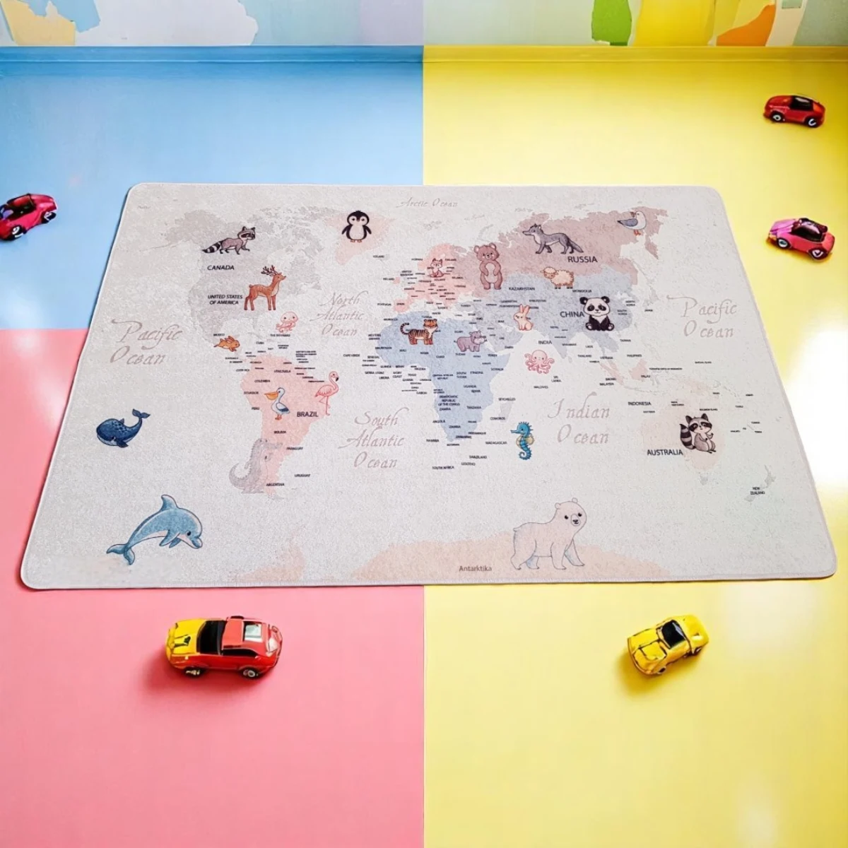 Edukativni tepih s mapom svijeta u pastelnim bojama. Prikazuje kontinente, zemlje i njihove karakteristične životinje poput pande, pingvina, kita, jelena i flaminga.